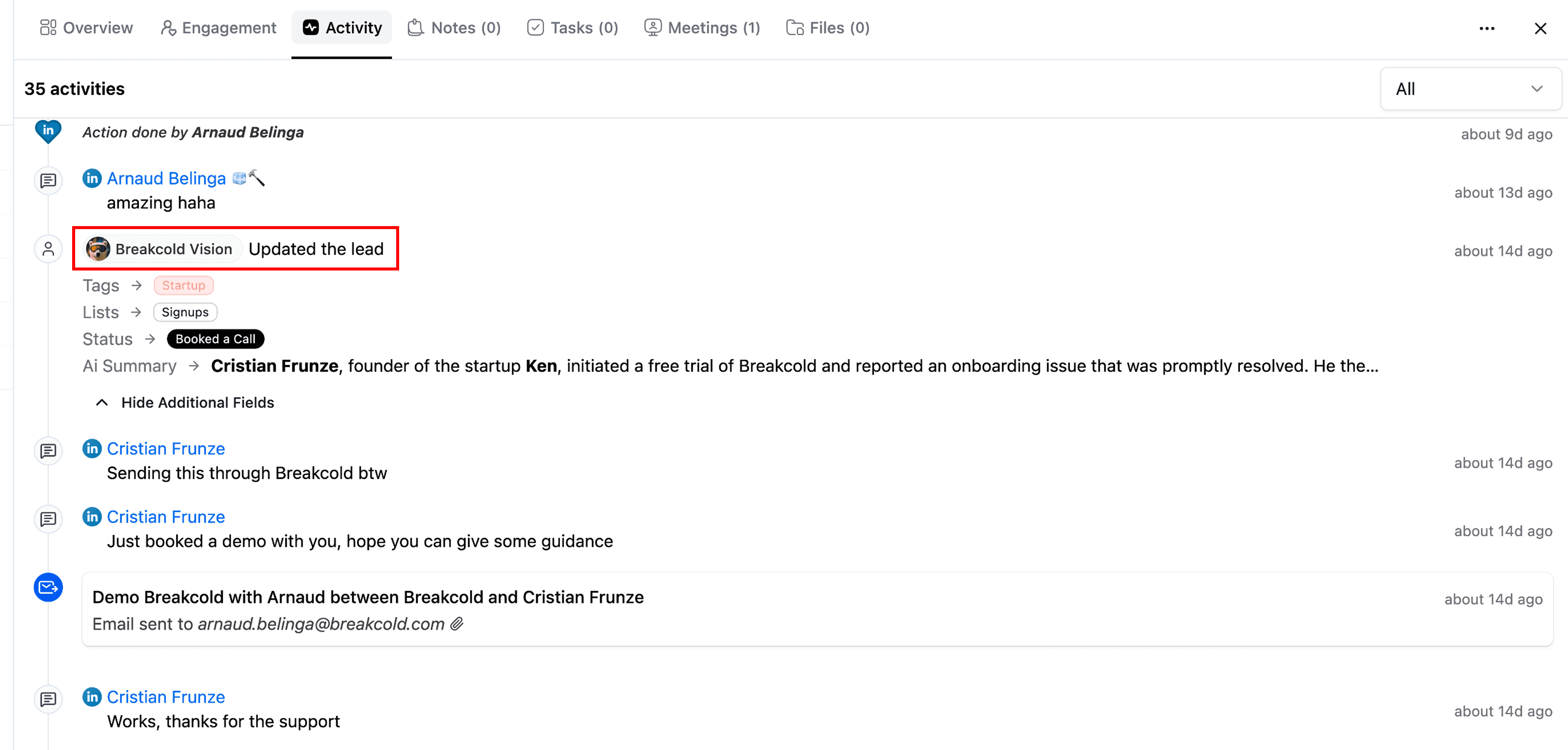 Breakcold automatically move leads in your CRM depending on your interactions with them, it auto-assign tags & more!